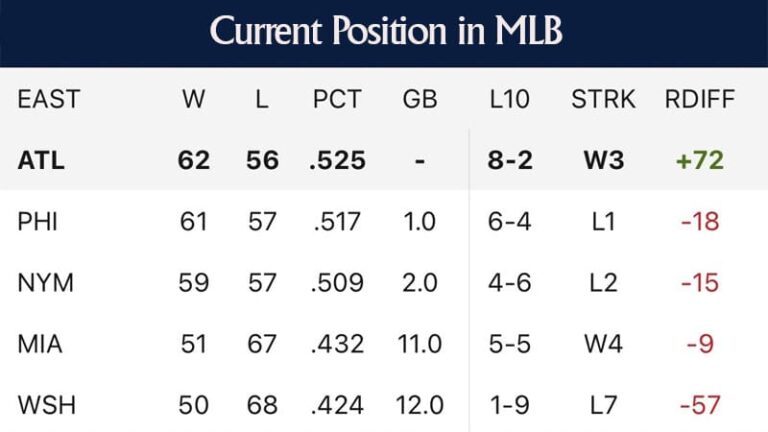 Det står den 10 juli 2023 när Atlanta Braves gjorde 60-29 på NL East. Sie ligger 8.5 Spiele vor den zweitplatzierten Miami Marlins. The Braves har nu All-Stars, inklusive Ronald Acuña Jr., Sean Murphy, Orlando Arcia, Matt Olson, Ozzie Albies, Austin Riley, Spencer Strider och Bryce Elder.